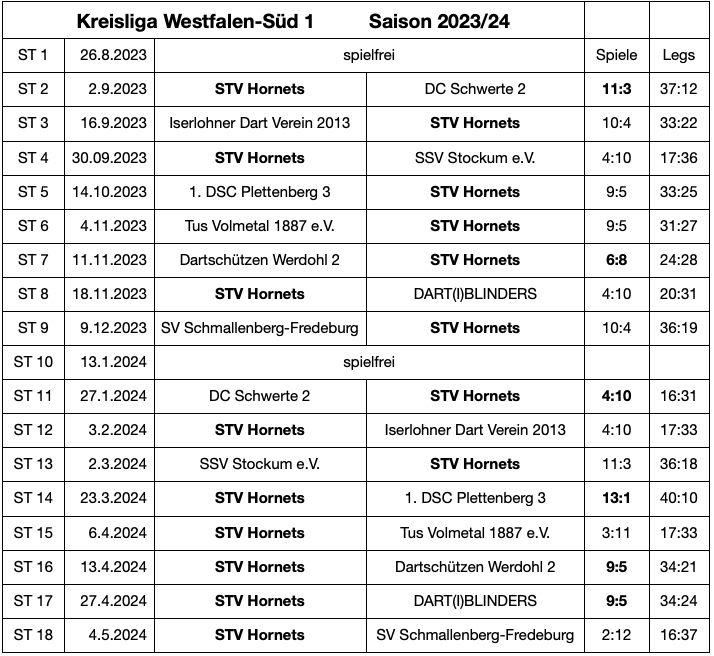 Auch für die Saison 2023/24 hatten wir eine Mannschaft in der Kreisliga Westfalen-Süd 1, kurz KLWS1, des NWDV (Nordrhein-Westfälsicher Dartverband) gemeldet.